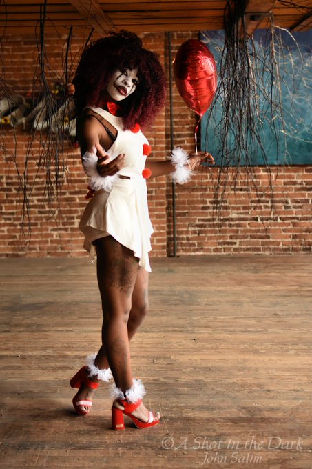 #PennyBBain as #Pennywise has got It goin' on . . #cosplay #It #StephenKing #clown #evil #balloon #red #womanofcolor #redhead #curlyhair #tattoos #legs #heels #sandals #picoftheday