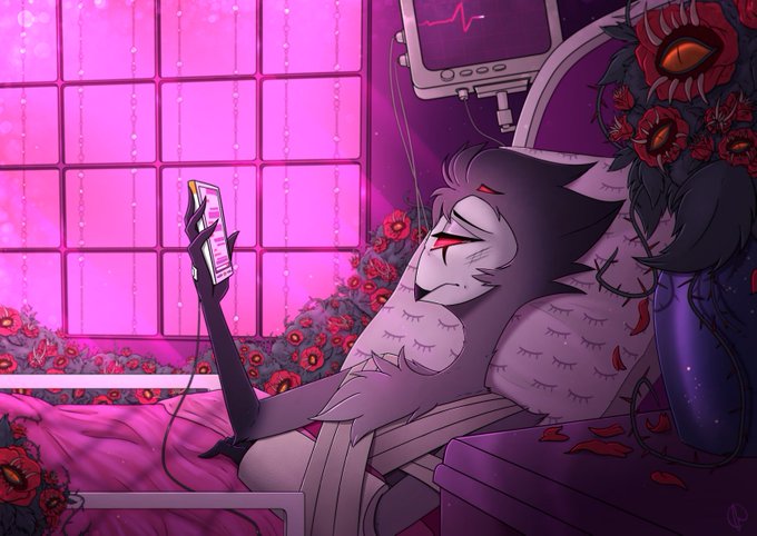 I kept expecting Blitz to suddenly burst through the window holding a bunch of lollies and balloons and that's why he didn’t reply because he was hauling himself up the side of the hospital... #HelluvaBossStolas #HelluvaBossBlitzo #HelluvaBossSpoilers #artofrhues
