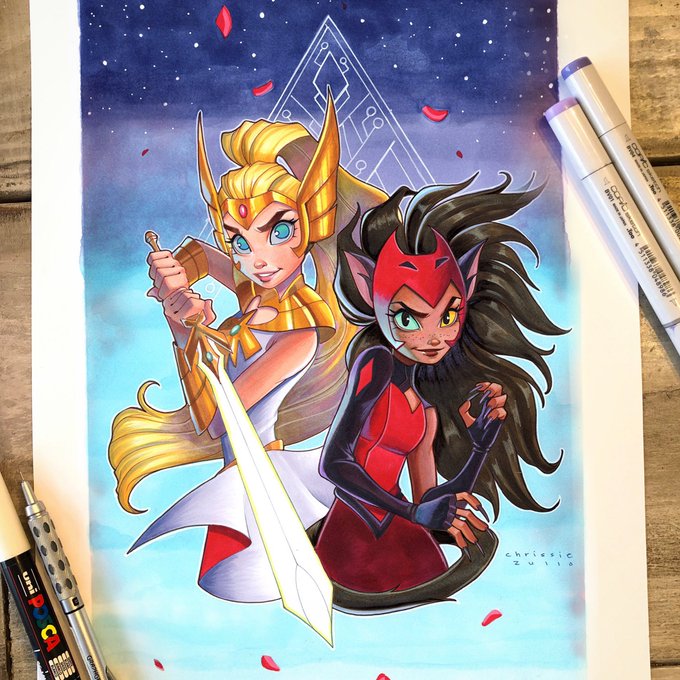 She-Ra and Catra drawing, part of an art trade ! Drawn with Copics, Ink, and Graphite on paper. Was a lot of fun, hope you all like it 🙂. #shera #catra #adora #heman #traditionalart #copicmarkers