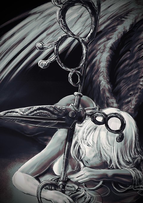 枷を解いた羽根を、切り落として (全体像のほう すこしぼやけてしまった感) (お名前簡単にしてみました) #オリジナルイラスト #匿れ天使 #HiddenAngel #絵描きさんと繋がりたい #絵柄が好みって人にフォローされたい