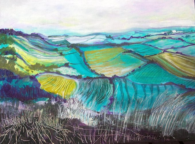 Looking across the hills to a brighter future - I do love to paint undulating hills & the pattern of fields in UK countryside - & the way the crops create a linear pattern #fields #fences #hills #landscape #ArtistOnTwitter #art #painting #artists