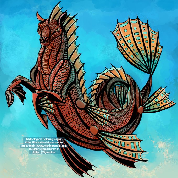 Happy #Mermay! here is a horse mermaid 😂 jk it's a #hippocampus but i think it kinda counts! (this was the coloring page from april! page and WIPs are available to both patr0n and k0fi supporters) #illustration #mythology #fish #horse #digitalart