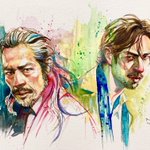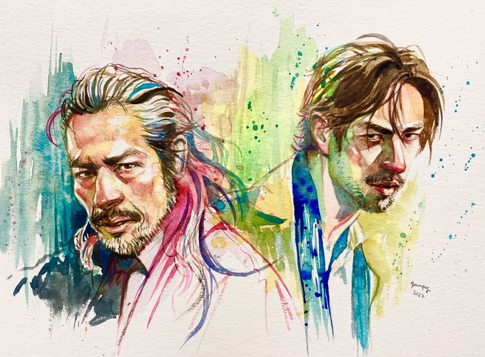 エルダーの父子を描いてみました。 映画「ブレット・トレイン」のエルダー(真田広之さん)とキムラ(アンドリュー・小路さん)。 アンドリュー・コージさんのファンなのでキャスティングとてもとても嬉しかったです。 #bullettrain #hiroyukisanada #andrewkoji #fanart #watercolor