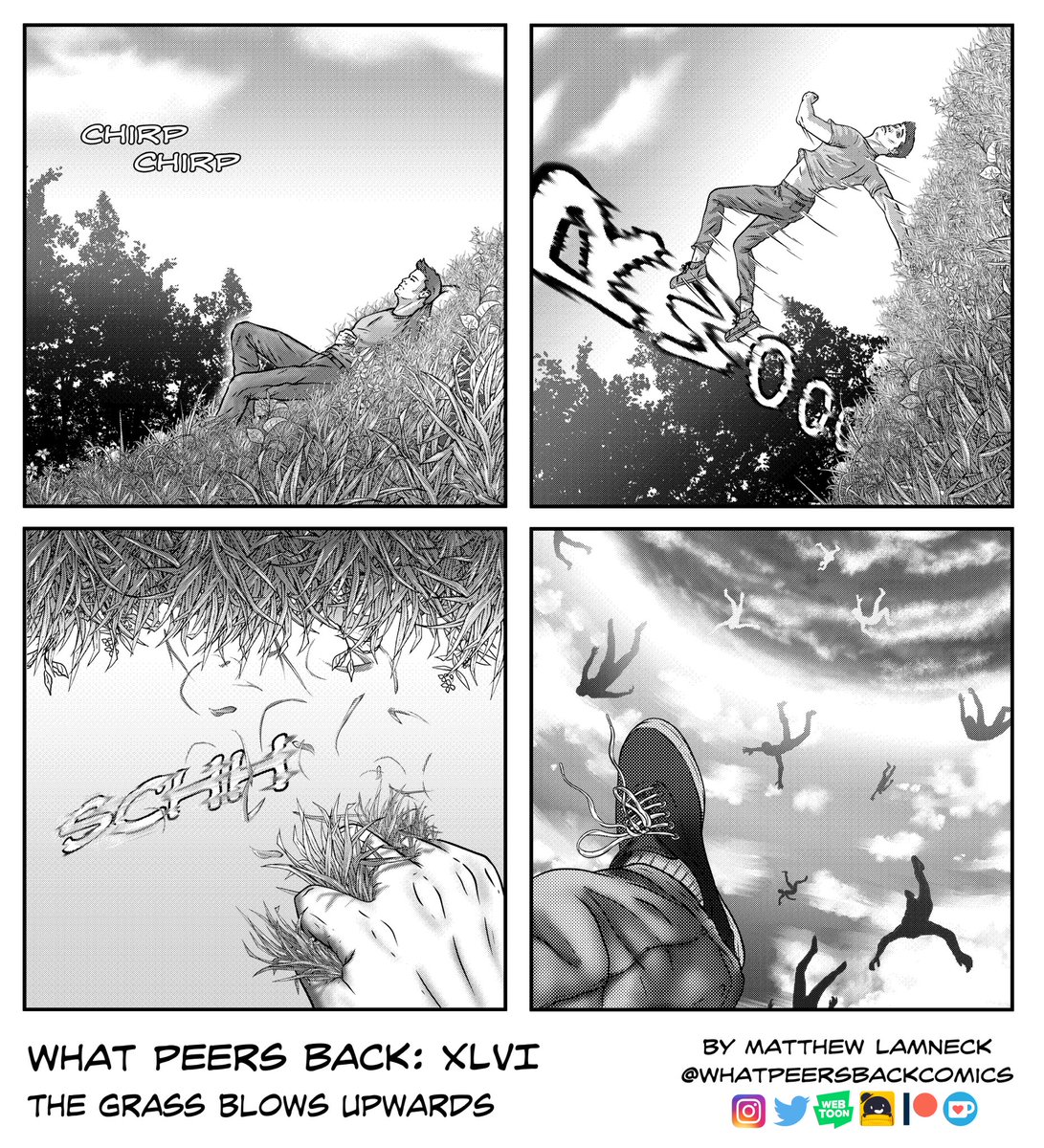 What Peers Back XLVI: The Grass Blows Upwards … The forces that hold us chose to set us free. … #horrorart #horrorcomic #horrorcomics #comic #4panelcomic #manga #mangaart #webcomics #art #illustration #digitalcomic #creepypasta #creepyart #whatpeersback #inktober @webtooncanvas