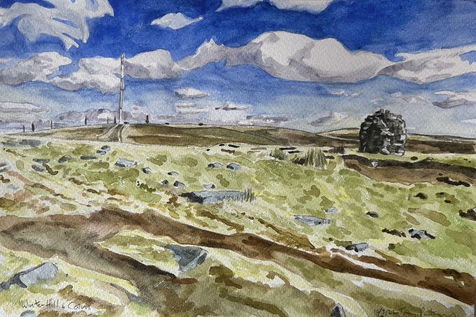 “Winter Hill & Cairn” #Watercolour sketch from last weekend’s walk. Up top this time. #horwich #rivington #winterhill #smithillsestate #rivingtonpike #westpennines #walking #sketch #sketchbook #painting #landscape #art #illustration #watercoloursketchbook #marchmeetthemaker2022