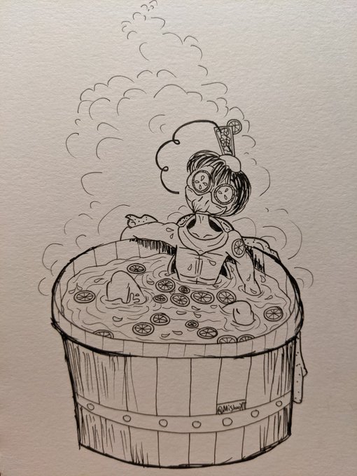 Inktober Day 14: Citrus Even kappas need to take a break from oily swamp water and take a citrus bath to detox. They know when to relax, like we all should. #inktober2021 #kappa #hotspring