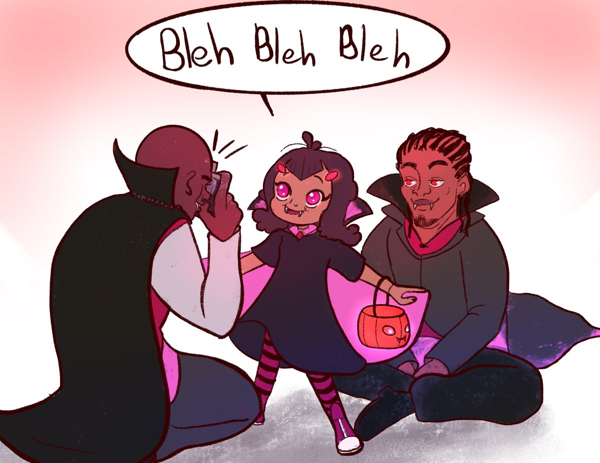Day 6 of my Trick or Treatober project. These dads have a lil girl who is obsessed with #HotelTransylvania , so they are a family of vampires for Halloween! #blacktober #KidLitArt #ChildrensBooks #illustration #TrickorTreat