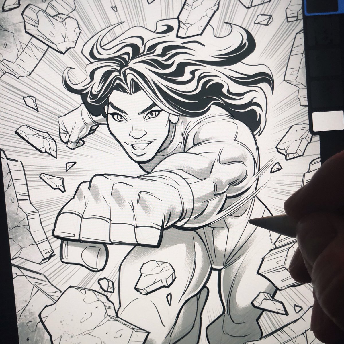 Some She-Hulk busting action comin in hot 😁 Looking forward to the series in August! Workin on this one in Pro Create on the iPad Pro, more coming soon! #shehulk #workinprogress #hulksmash #marvel #procreate #sketch #drawing #illustration #art #artwork #digitalart