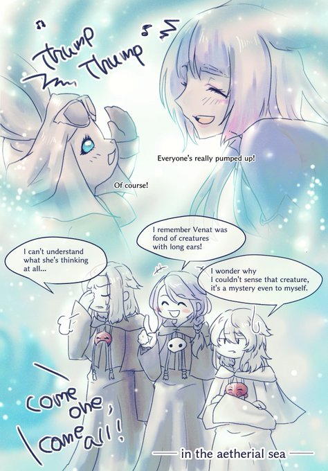Leporrits, my WoL, and People in the aetherial sea. #FFXIVART #EmetSelch #Hythlodaeus #Elidibus