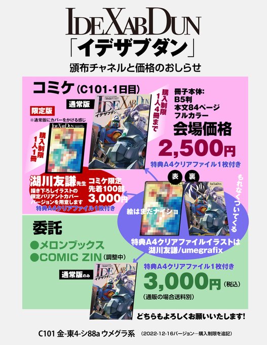 イデザブダン頒布のおしらせに、コミケでの購入制限の情報を追記しました。 限定版はお一人様1冊限り、通常版は4冊までといたします。 どうぞよろしくお願いいたします。 #IDEXABDUN #イデザブダン