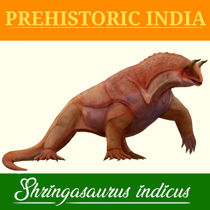 Good evening #India, let's meet an animal that once lived in our country millions of years ago. Not a Dinosaur, but still very reptilian. This is Shringasaurus indicus, artwork by me #Prehistoric_India #paleoart #paleontology More information in thread below ↓