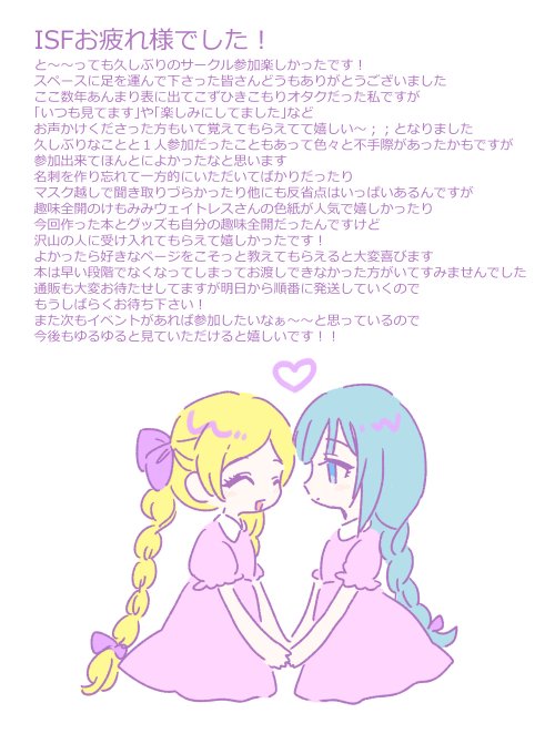 本日は本当にお疲れさまでした!!すっごくたのしかったー!! 新刊はメロン委託もしています!よろしくお願いします(*>_<*)ノ 🙇→melonbooks.co.jp/detail/detail.… #ISF09 #麗花帽子コレクション