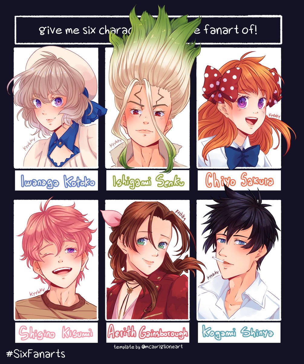 Late but sure, another #SixFanarts of charas I've never drawn before, suggested by you! I had fun with these 😂 ✨ _____________ #inspectre #kyokousuiri #iwanagakotoko #senku #drstone #chiyosakura #nozakikun #kisumi #tv_free #aerith #finalfantasy #psychopass #kogamishinya