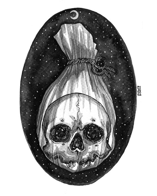 Day 06 : Midnight Delivery (@drawtober) • #art #illustration #painting #ink #indiaink #micron #drawtober #drawtober2022 #drawtobermidnightdelivery #artistsontwitter #instaartist #skull #skeleton #death #bones #moon #night #stars #horror #horrorart #halloween #spooky