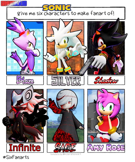 After many character requests, I present six Sonic character renders! Had a blast making these :) #sixfanarts #Sonic #SonicTheHedgehog #Blaze #Silver #Shadow #Infinite #Sage #Amy #AmyRose #Blender #Blender3D #sixfanart