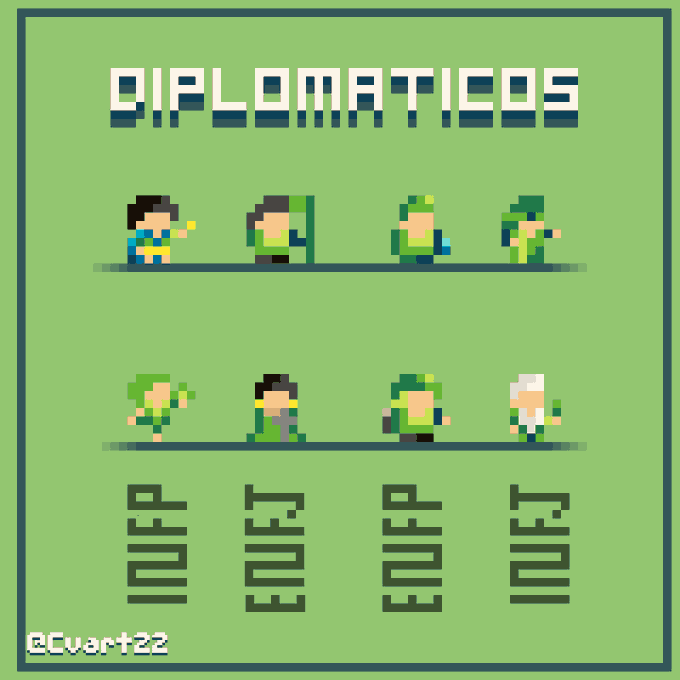 I have been working on the MBTI, these are the Diplomats in both sexes, I will continue working to make the ones that are missing.#MBTI #diplomats #diplomaticos #INFP #ENFJ #ENFP #INFJ #verdecitos #ドット絵 #pixelart #pixelartist