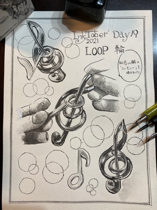 インクトーバーDay19、お題がLOOP「輪」という事で知恵の輪を描きました。今はお洒落で素敵な物がありますね😍。#inktober2021 #inktober2021day19 #kuretake_inktober2021 #inktober