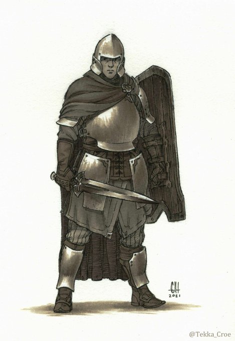 Inktober 23: Sentinel A stalwart and technical fighter, the sentinel's careful defensive posture belies the swiftness of his blade. #Inktober #inktober2021 #inktober2021day23 #ink #art #traditionalart #fantasyart #characterdesign