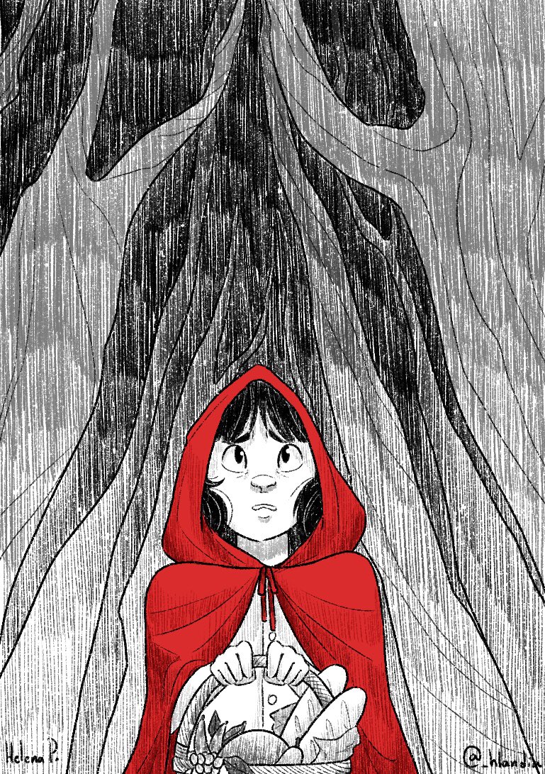 Dia 11 - Floresta 🌳 E seguindo o conselho do lobo e contrariando sua mãe, chapeuzinho vermelho adentra o “atalho” na floresta escura #inktober2021 #inktober2021day11