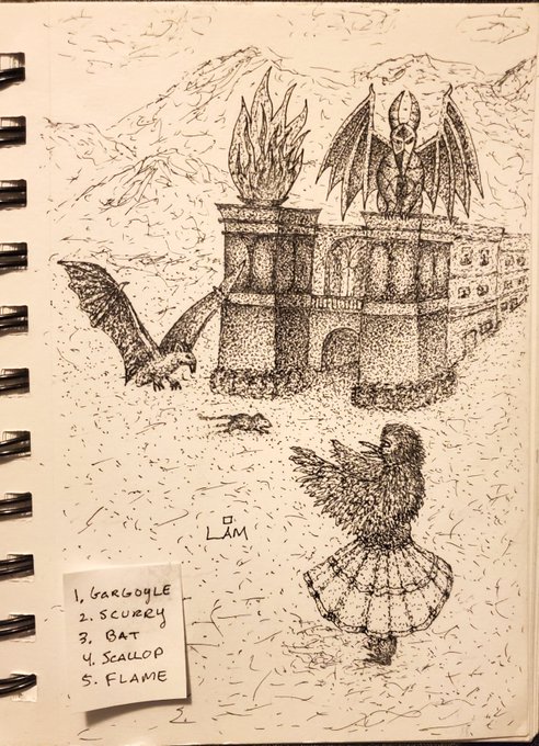 Second year doing Inktober, first on Twitter. Days 1-4: Gargoyle, Scurry, Bat, Scallop #Inktober #Inktober2022day1 #Inktober2022day2 #Inktober2022day3 #Inktober2022day4