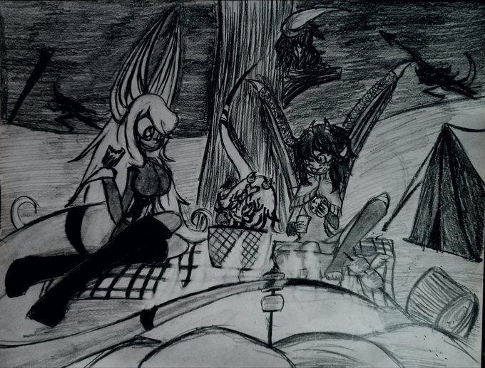 Día 28: CAMPING Una grandiosa noche para asar unos malvaviscos OC de compañia: la linda Oguis, propiedad de @OldeNightmare, sigan a este talentoso artista #OC #traditionalart #dibujoalapiz #drawing #draw #dibujo #Inktober #inktober22