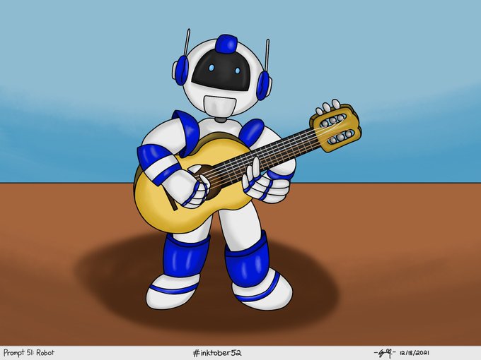 Prompt 51: Robot 🤖 “The Guitarist Bot” I can’t believe I did this again. Basically, this is about a robot that plays guitar in the room. (Dedicated to my fellow musician who’s a guitarist and a male singer-songwriter) #inktober #inktober2021 #inktober52 #inktober52robot