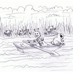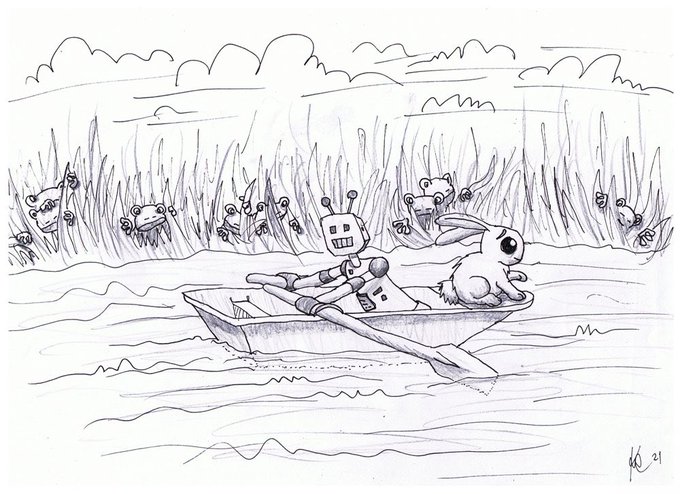 Robert the robot in a rowboat with a rabbit surrounded by ribbets. #inktober #inktober52 #inktober52robot #robot #art #drawing
