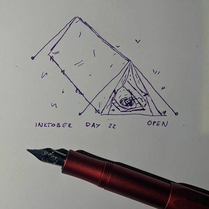 Inktober day 22: open. Drew this by torchlight, in a tent myself. A bit rushed. . #inktober #inktober2021 #inktoberopen #day22 #open #ink #purpleink #kwzberry #pen #fountainpen #kawecoalsport #tent #camping #drawing instagr.am/p/CVY5C4Lo4Lz/
