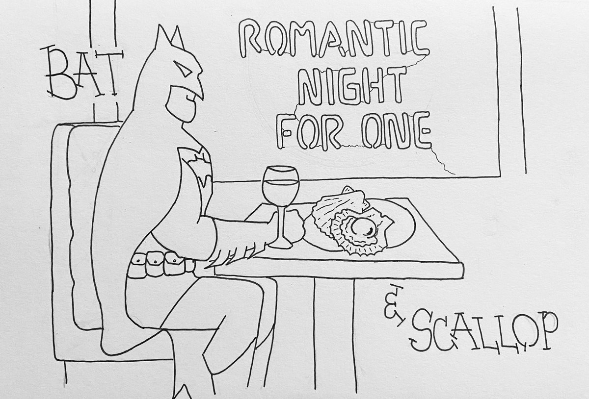 Days 3 + 4… Even badass, brooding heroes need a romantic meal once in a while Prompt 3: Bat Prompt 4: Scallop The doodling continues #Inktober #Inktober22 #Inktober2022 #Bat #Scallop #DayThree #DayFour #InkwellFilter