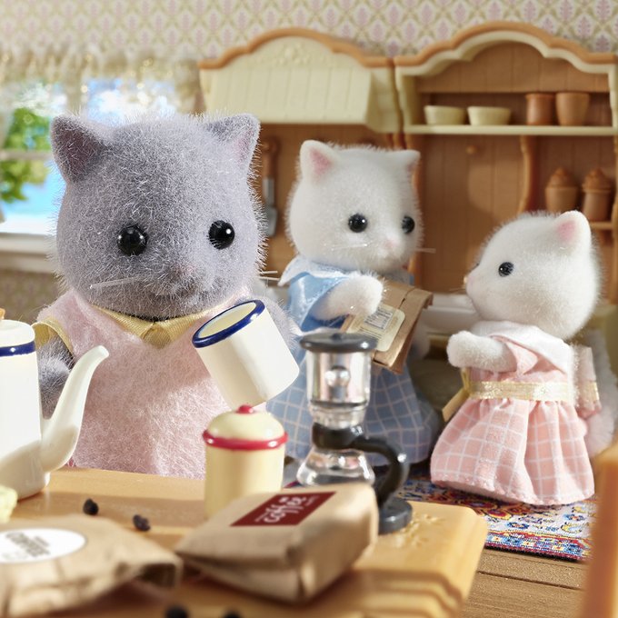 ペルシャネコのペルシアン家では朝から #コーヒー のいい香りが漂っています☕ 「お父さん何してるの?」 「自分だけのコーヒーをブレンドしてるんですって」 「へぇ~!楽しそう!」 どんなコーヒーが出来るか楽しみですね✨ #シルバニアファミリー #シルバニア #internationalcoffeeday