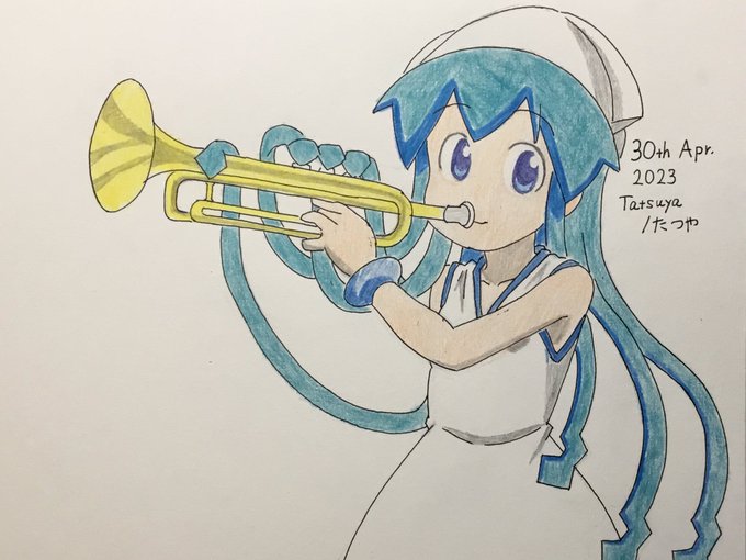 Trumpeter イカ娘 / Squid Girl For #InternationalJazzDay #国際ジャズデー Reference : Picture of Louis Armstrong #イカ娘 #SquidGirl #Illustration #Drawing #イラスト