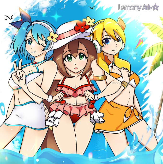 after a long time I was able to finish drawing it 💖💖💖💖 we are already in January so why not celebrate on the beach?? 0w0 💜🖤✨💖hoped you like it! 😚 #MegamanX #ROCKMANXDIVE #fanart #digitalart #iris #Alia #rico #opencommissions #ロックマンXダイブ #アイリス #エイリア #リコ