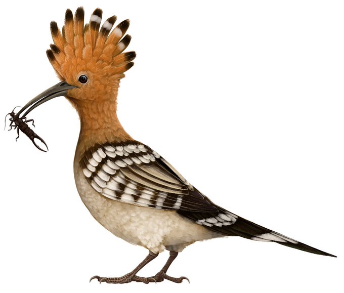 The St Helena Hoopoe is from said island in the South Atlantic. It was a large hoopoe with small wings & was potentially flightless. It was alive as recently as the 1550s. Here it's eating a giant earwig, another extinct endemic from St Helena. #IslandFaunaWeek #paleoart [4/n]