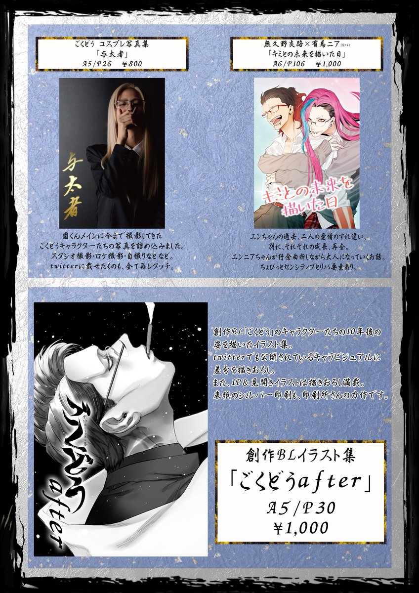 【J庭お品書き】 COMITIA141+J.GARDEN52合同開催のお品書きになります! また一部グッズ等の完売まことにありがとうございます!👏👏👏 #J庭 #J庭52 #ごくどうafter twitter.com/heyhey_r/statu…