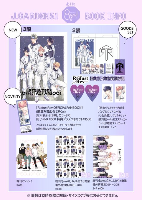 🍒4/3 J.GARDEN51 INFO☁️💜 💫NEW💫 ✔️RedustRev.ファンブック(¥600/特典グッズつきセット¥1500) ✔️リダレボツアータオル(¥1800) ✔️たかひな赤ちゃんちびアクスタセット(¥1200) ※後日すべて通販※ #J庭 #J庭51 #捕食対象ひなどりくん #捕食対象ひなどりくんアンコール
