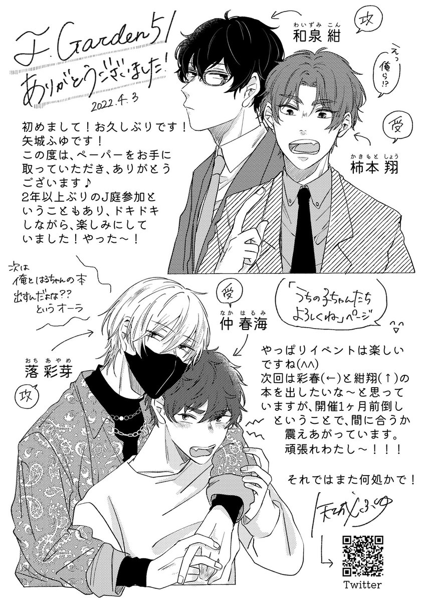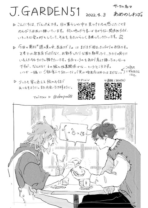 ◤#J庭51 お品書◢ あ-𝟏𝟑𝐚【𝐃:𝐁𝐑𝐀𝐍𝐃】 🤎新刊「𝐼 𝐿𝑂𝑉𝐸,𝐻𝑖𝑚」 《冊数制限》開始時→5冊 ☑︎制限解除につきまして12時に一度Tweet致します✨ 🤍既刊「un silent night」※極少 ▽新刊sample pixiv.net/artworks/97354… 皆様にお会いできるのが楽しみです! よろしくお願いします☺️