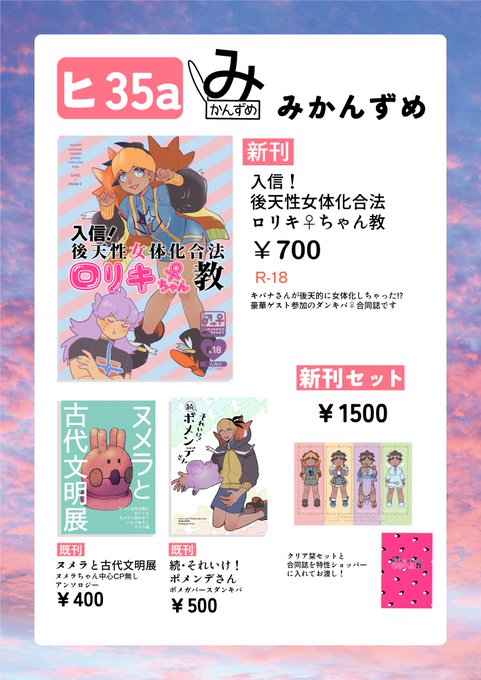 【6/25頂上熱戦おしながき】 東2ホール ヒ35a みかんずめ 新刊はダンキバ♀合同誌です。 新刊セットもあります🙋♀️✨ロリキちゃんのポスターが目印!よろしくお願いいたします。 既刊・新刊詳細→crepu.net/user/iHnrxTuW6… #JBF2023dnkb