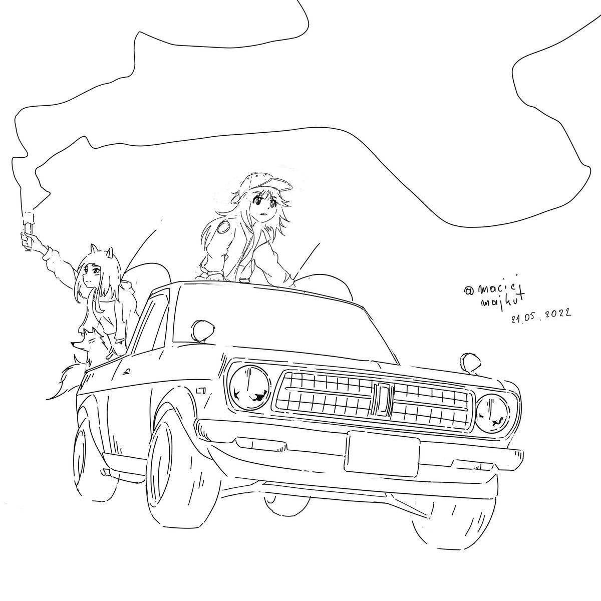 nissan datsun b122 drawing with OC's i wanted to practise with characters in perspective and it looks quite good i think hope you guys like it ❤️ #drawing #digitalart #sketch #rkgk #datsun #anime #animegirl #painting #japan #cars #art #artist #jdm #sunnytruck #originalcharacter