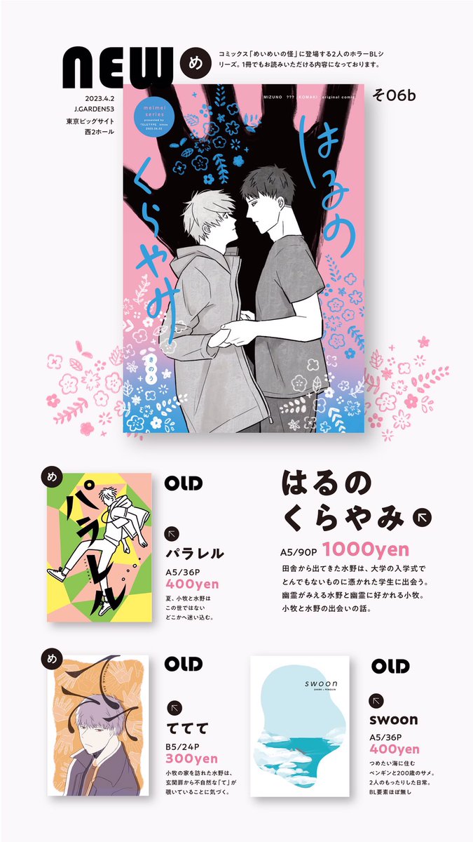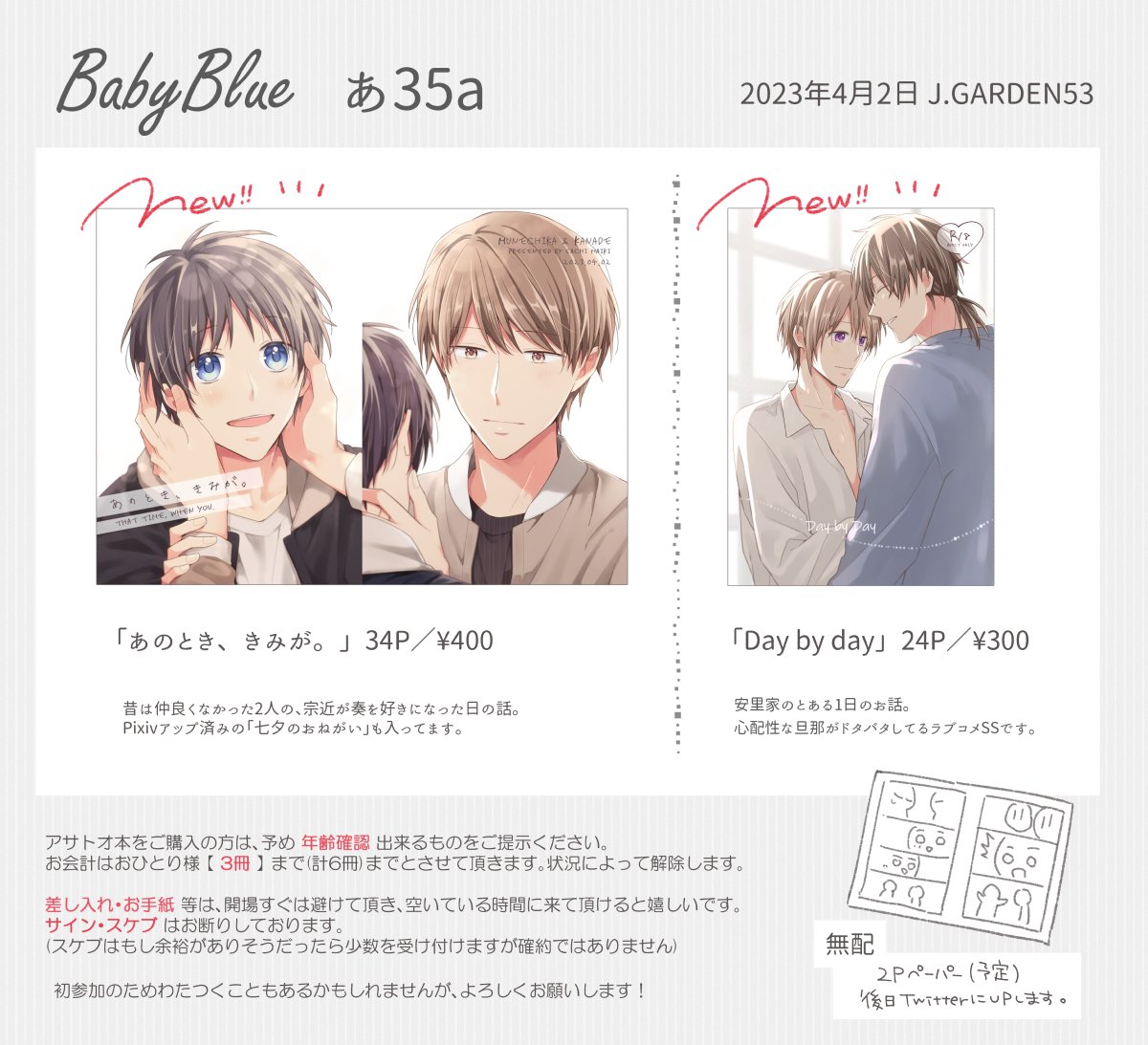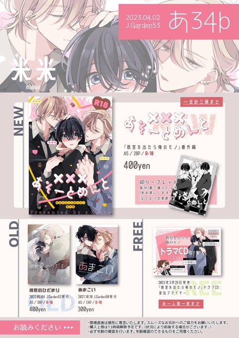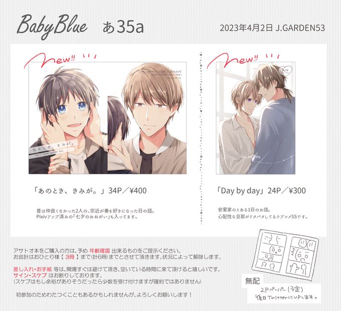 -`📢🐻❄ 2023/4/2 #J庭53 お品書き スペース【あ34b】で参加します! 当日は画像下の注意事項をご一読の上お越しください 新刊サンプルや通販の案内はリプに繋げます👇🏻 #JGARDEN53 #創作BL