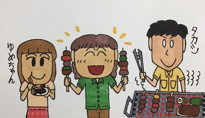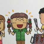 「#JKアキ子ちゃんイラスト」です。食欲の秋です。友達と一緒にバーベキューをするアキ子ちゃんです。焼くのはタカシ君です。「食べるのは楽しい!JK」でした。#高校生 #バーベキュー #食欲の秋 #食いしん坊の日 #友達 #イラスト #illustration
