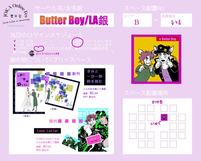ラブジャニはアンソロ以外の新作は無いかもしれませんが何か出せたら当日プロフカードに追加しておきます コアタイムは前回同様会場内にはいます😁 終了近くその他書いてない時間にも多分頻繁に会場内を巡回してると思いますので、お気軽にお声がけください #JKonlinefes #JKonlinefes1127 #ラブジャニ