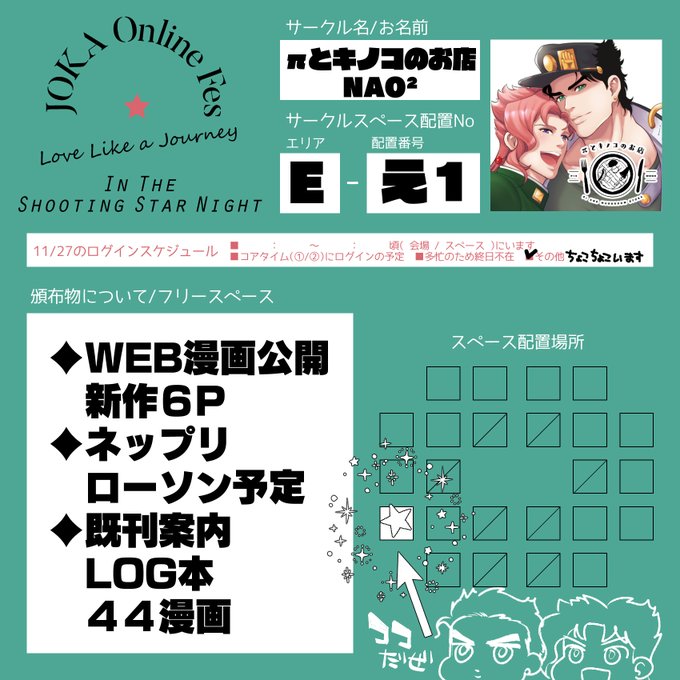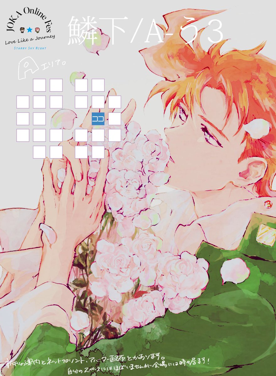 ラブジャニのスペース場所とお品書きなどです〜Eのい2に居ます!が、多忙過ぎて不在が多いですすみません!63承花の新刊サンプルをpixivにて公開予定ですが出来上がってからの公開になる為もしかしたら遅くなるかもしれませんすみません!宜しくお願いします! #JKonlinefes #JKfes221127 #ラブジャニ