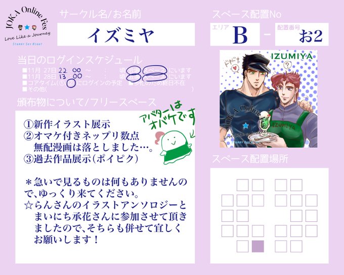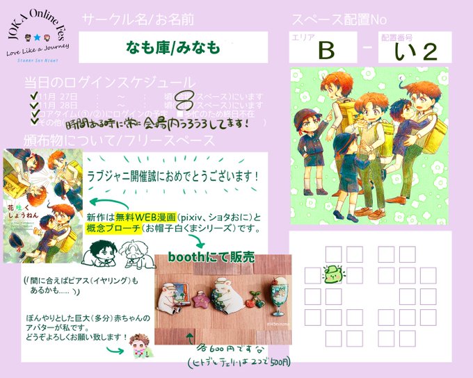 ラブジャニはアンソロ以外の新作は無いかもしれませんが何か出せたら当日プロフカードに追加しておきます コアタイムは前回同様会場内にはいます😁 終了近くその他書いてない時間にも多分頻繁に会場内を巡回してると思いますので、お気軽にお声がけください #JKonlinefes #JKonlinefes1127 #ラブジャニ