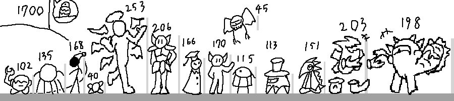 うちの身長表!(センチメートル) 先取りに出てる範囲で!割とガバだけど アビス以下のやつらは-10〜20するかもしれない(ドグマわんとむは除く) でもまあ大体こんな感じ!!!! #JPの先取りおえかき #人外 #デフォルメ #創作 #夏の創作クラスタフォロー祭り