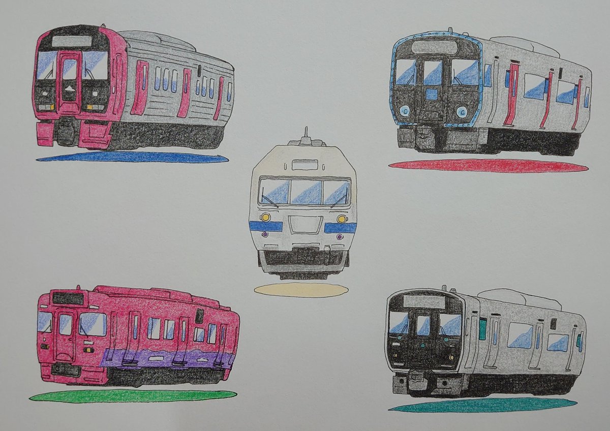 JR九州のデカおでこ電車たち バス用LED表示器を本格採用してのデザインで個性派揃いに その原点が食パン電車(719系)だった… #絵柄が好みって人がいればいいなぁ #イラスト好きな人とつながりたい #JR九州 #アナログイラスト