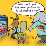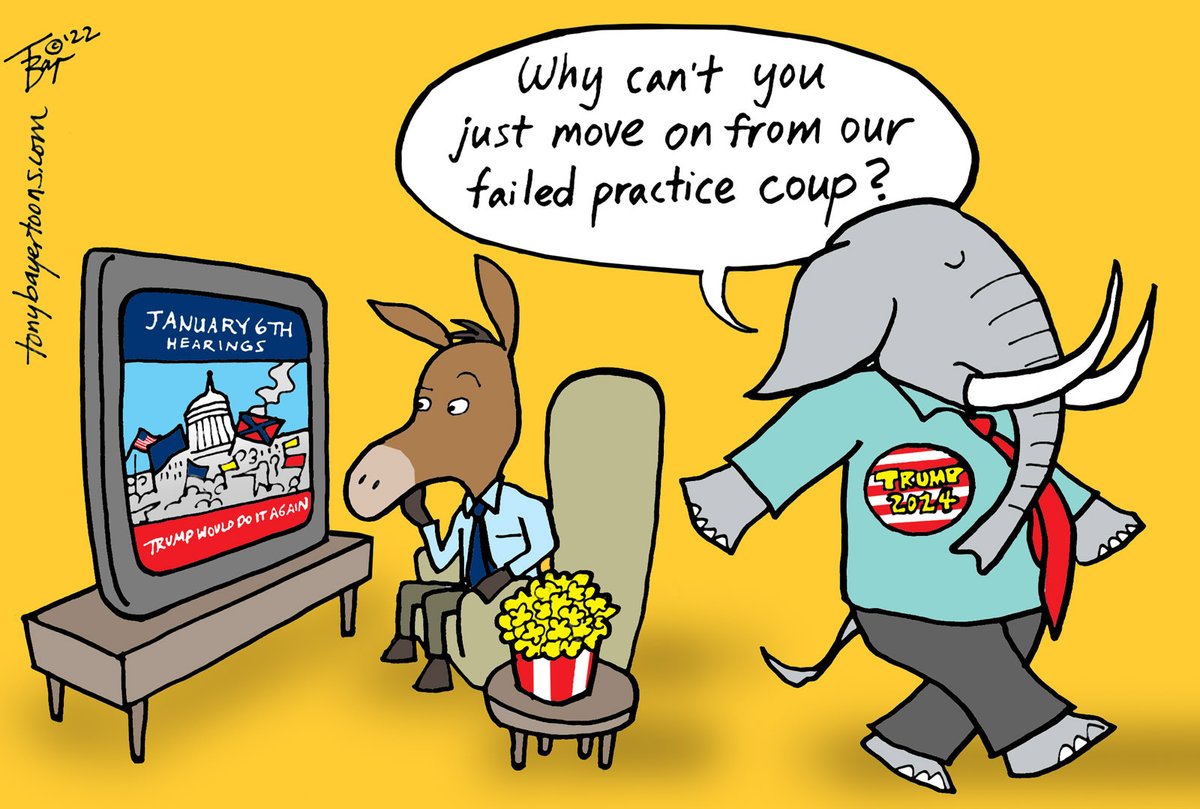 watching reruns...or previews of 2024? Seriously though, why is it difficult for the GOP to find a frontrunner who is not an unhinged, lawless psychopath? You'd think it would be easy. #cartoon #art #drawing #illustration #Jan6thHearings tonybayertoons.com/2022%200619%20…