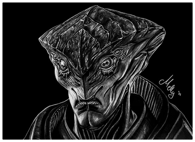 My coloured pencil drawing of Javik - edited with a black and white filter. 🖤🤍 #masseffect #bioware #javik #art #ArtistOnTwitter #traditionalart