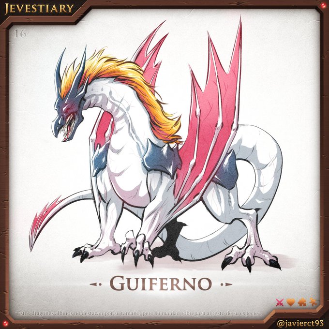 #Jevestiary 16 - Guiferno Ya tocaba empezar a dibujar dragones y que fuesen de nivel de peligro rojo (lo podéis ver en las esquinas de cada dibujo). Estamos en la segunda mitad del reto, así que es hora de sacar artillería (sin olvidar kawais). #DigitalArt #Inktober #inktober2022