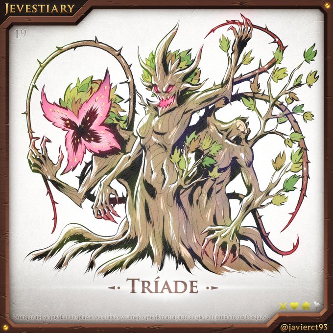#Jevestiary 19 - Tríade Tocaba hacer uno con motivo vegetal, así que en vez de una clásica dríade quise hacerla más monstruosa. La verdad es que la careta daría para halloween. #DigitalArt #Inktober #inktober2022