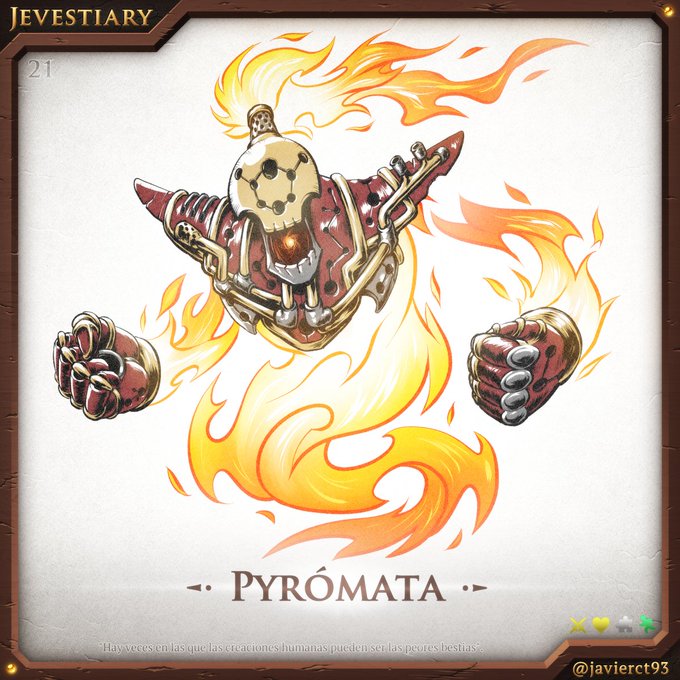#Jevestiary 21 - Pyrómata No podía faltar un monstruo mecánico en mi bestiario, así que combiné dicha idea con un elemental de fuego que tenía pensado. Más de uno de los anteriores es también un mix de diferentes bocetos que tengo ideados. #DigitalArt #Inktober #inktober2022
